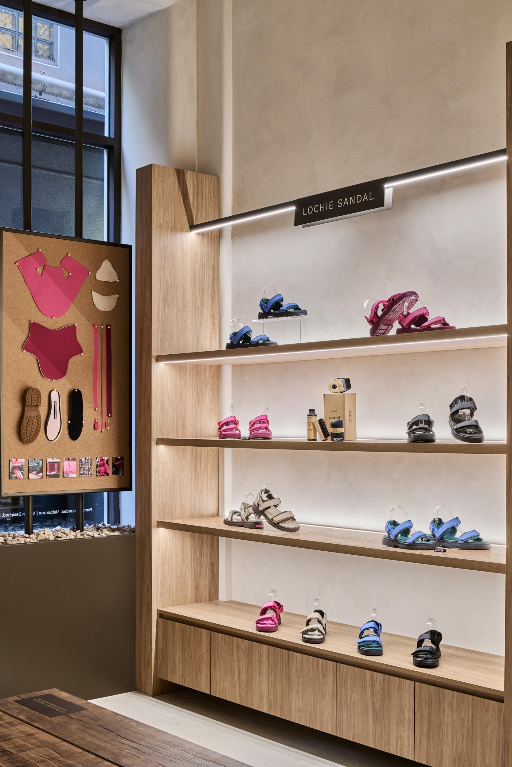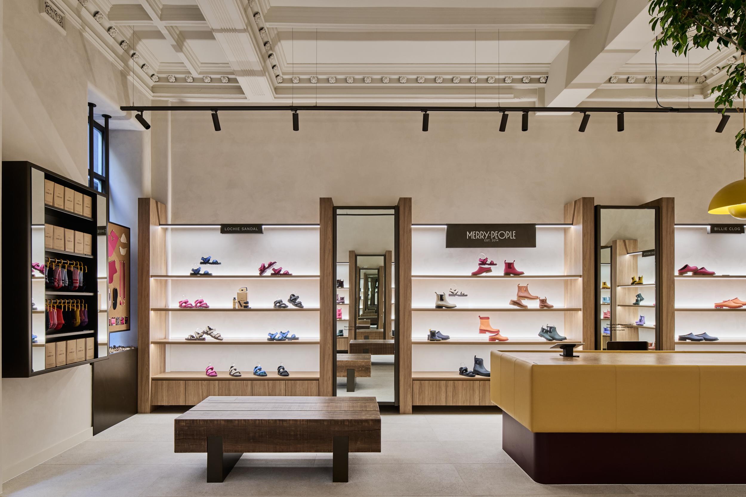 Materials, texture and colour are used to create a sensorial environment that feels grounded and natural, transporting customers away from the bustle of the city while intuitively showcasing the Merry People products.”