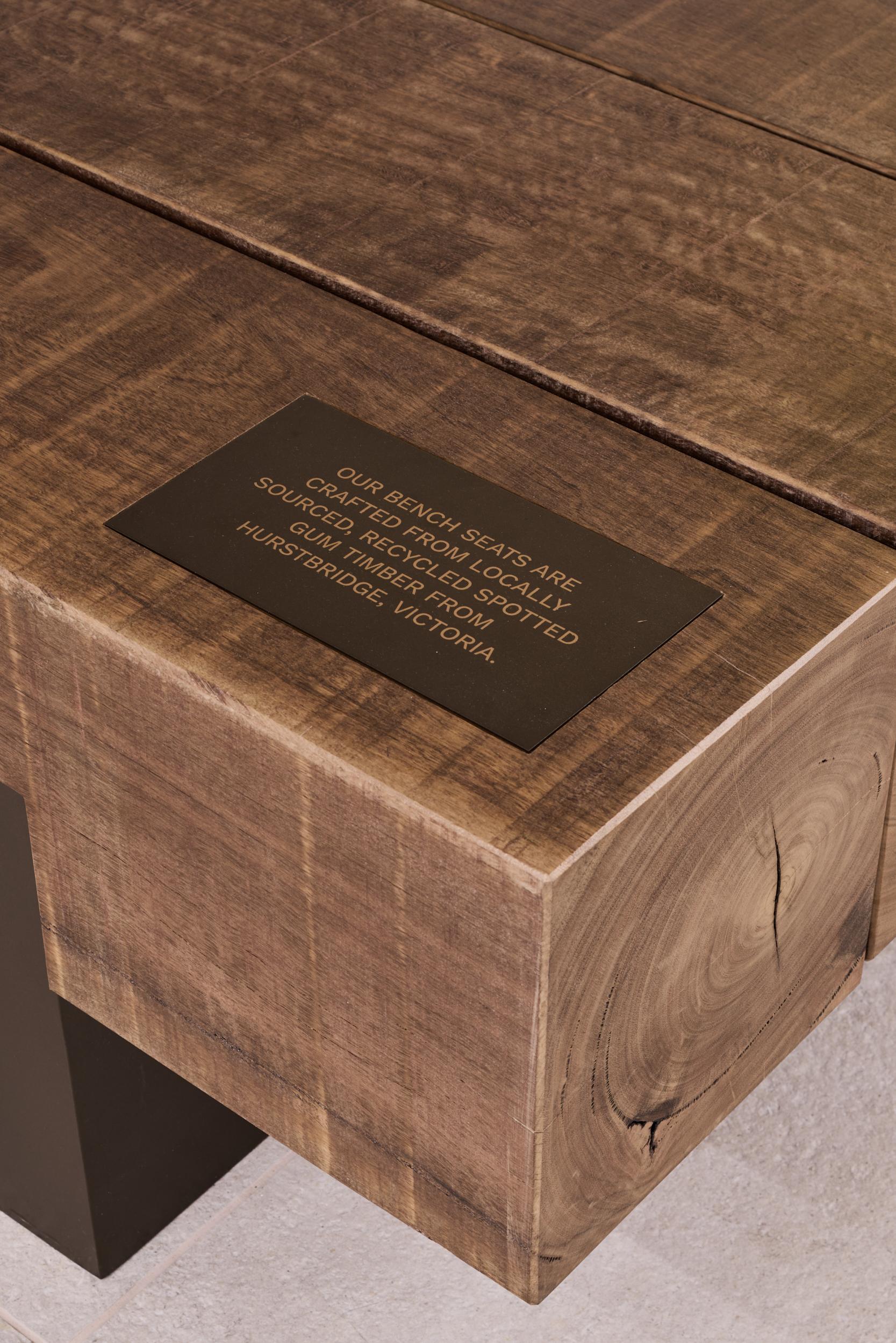 Referencing the brand’s Gippsland origins, the interior weaves together timber, stone and recycled rubber – telling a story of beginnings at farmers markets and an ongoing commitment to sustainability.