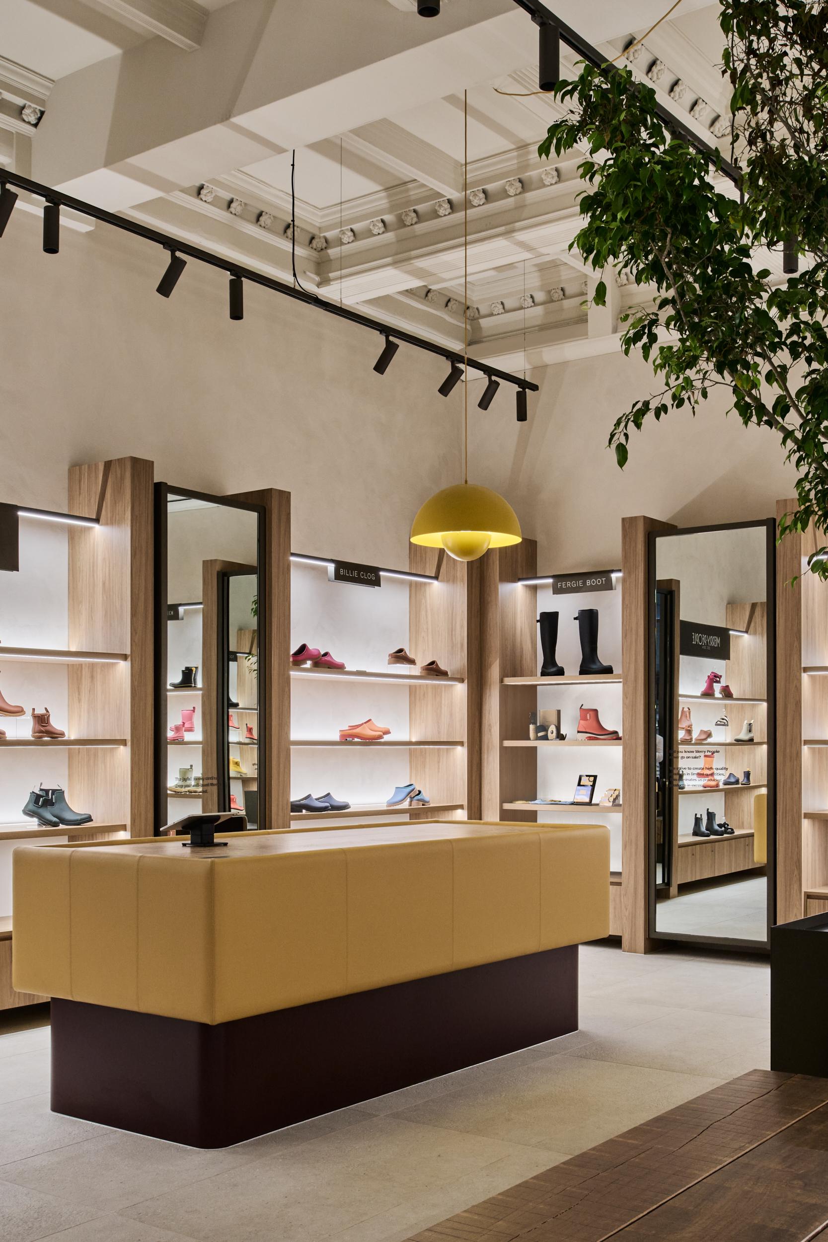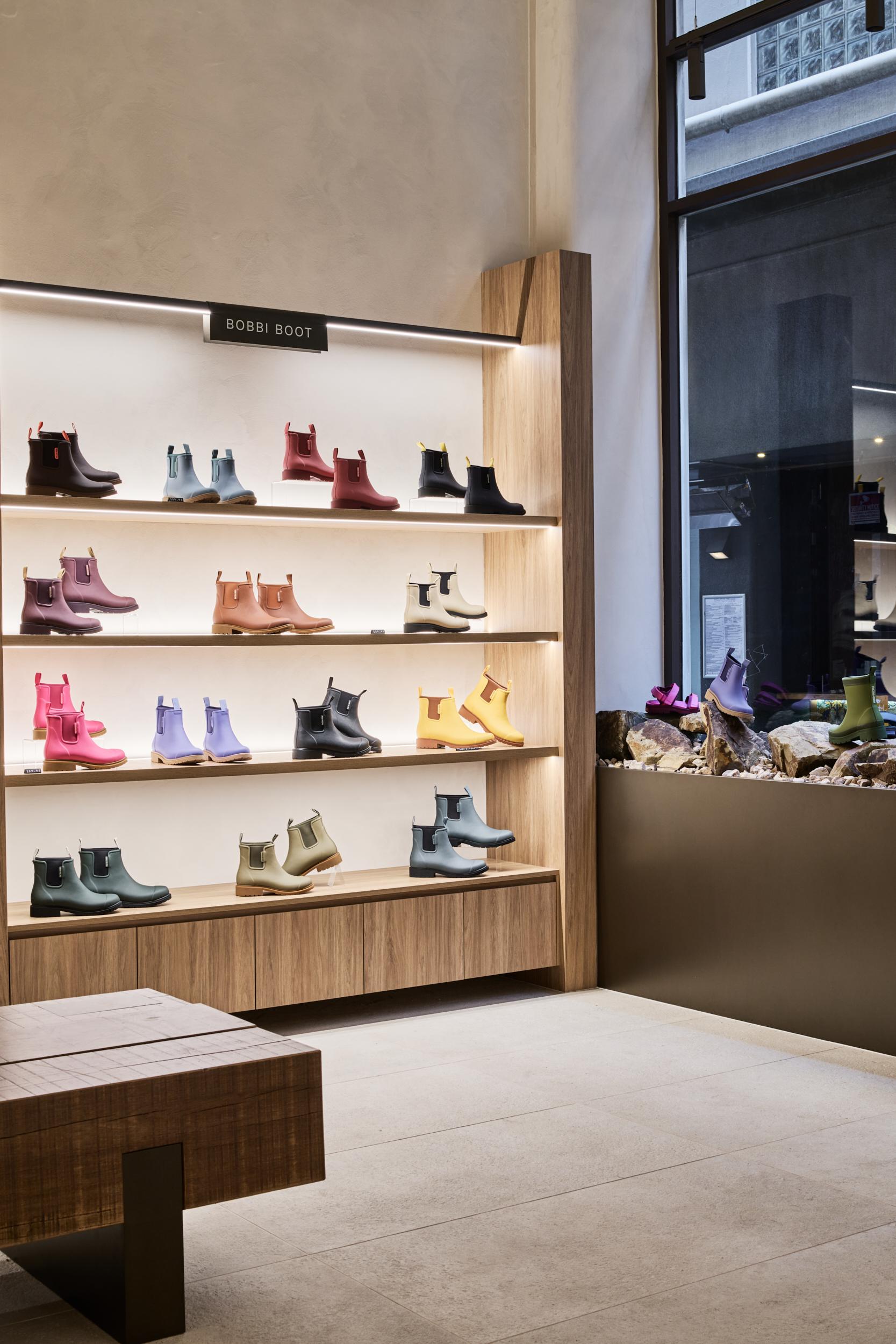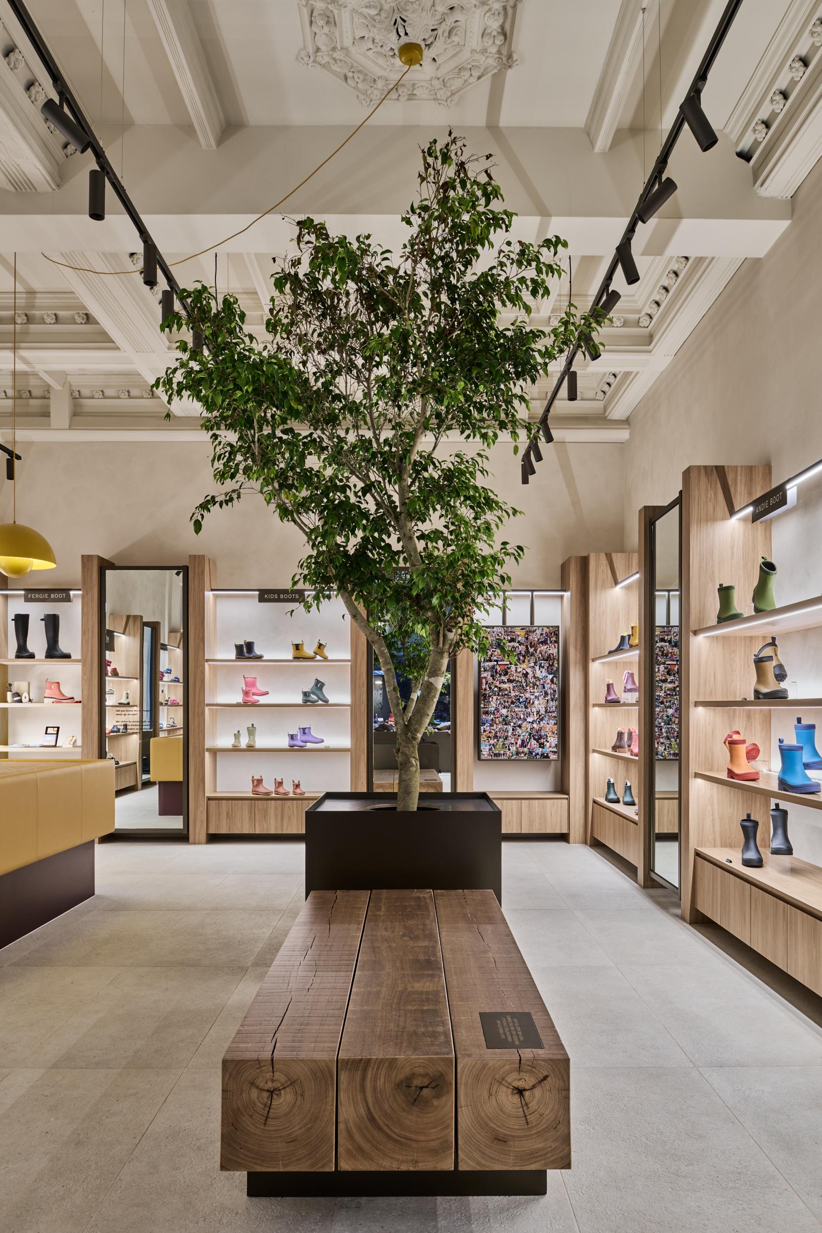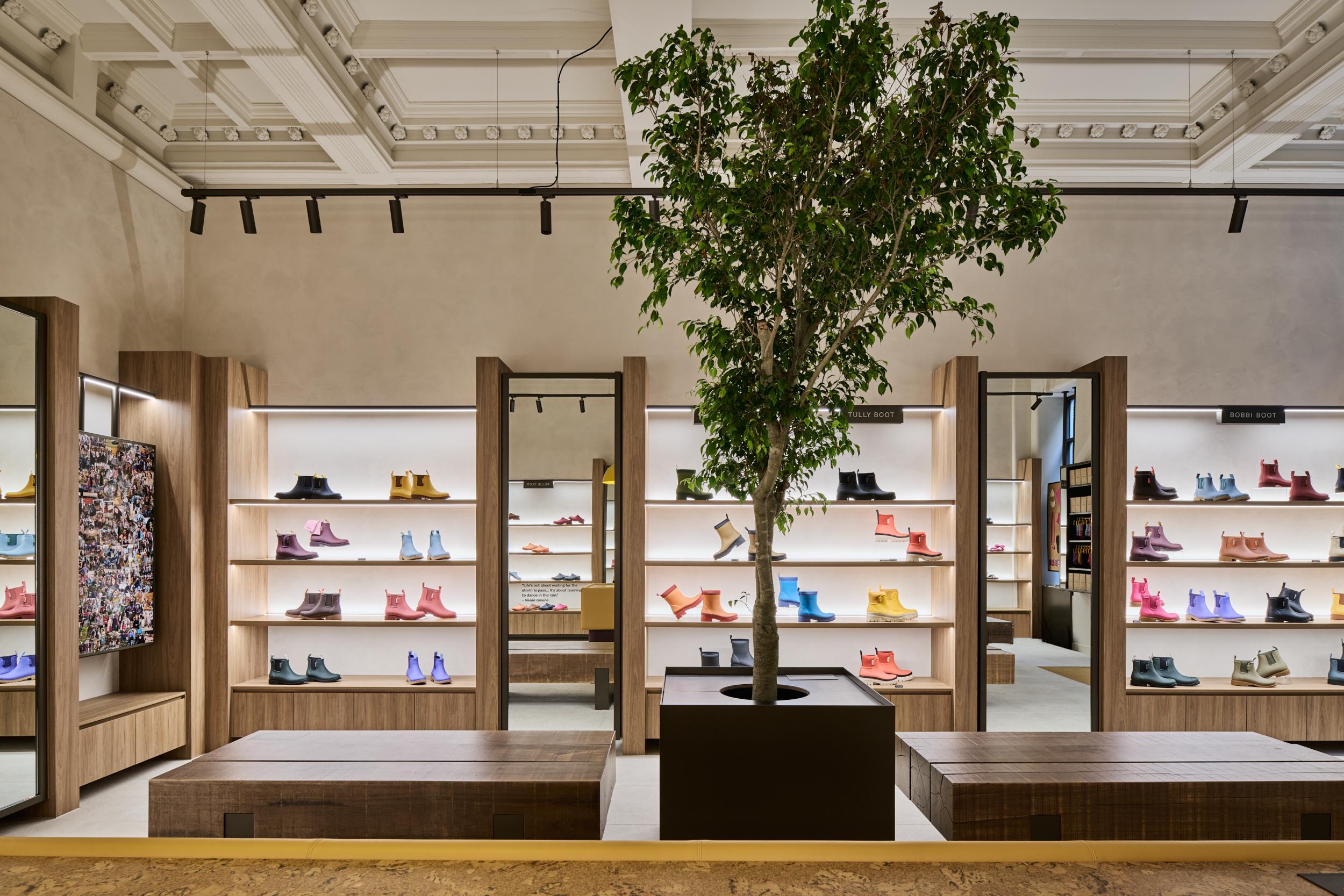 At the heart of the store, a central display with live planting anchors the space, while generous seating, full-height mirrors and an informal point of sale encourage customers to slow down, try on boots and engage.