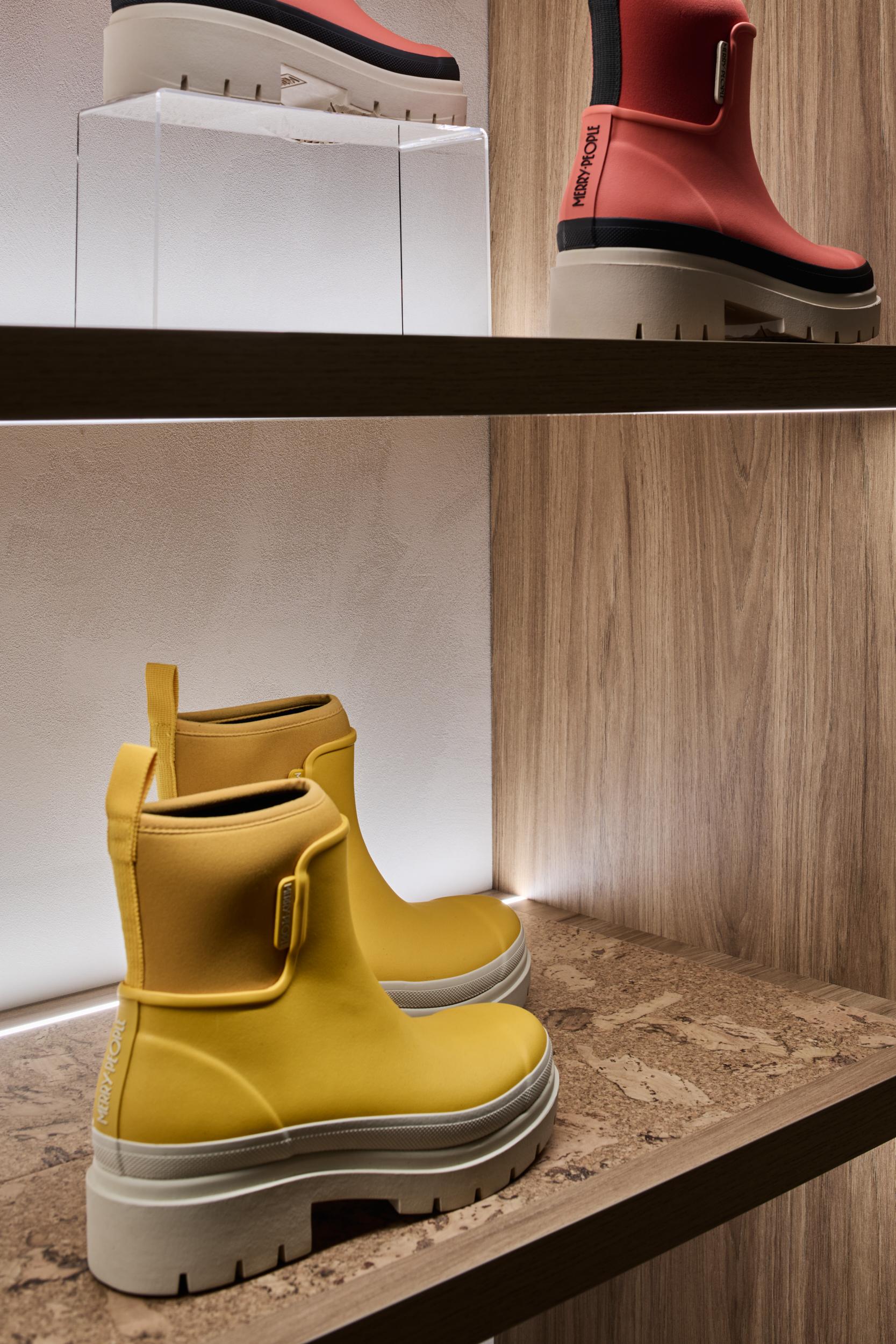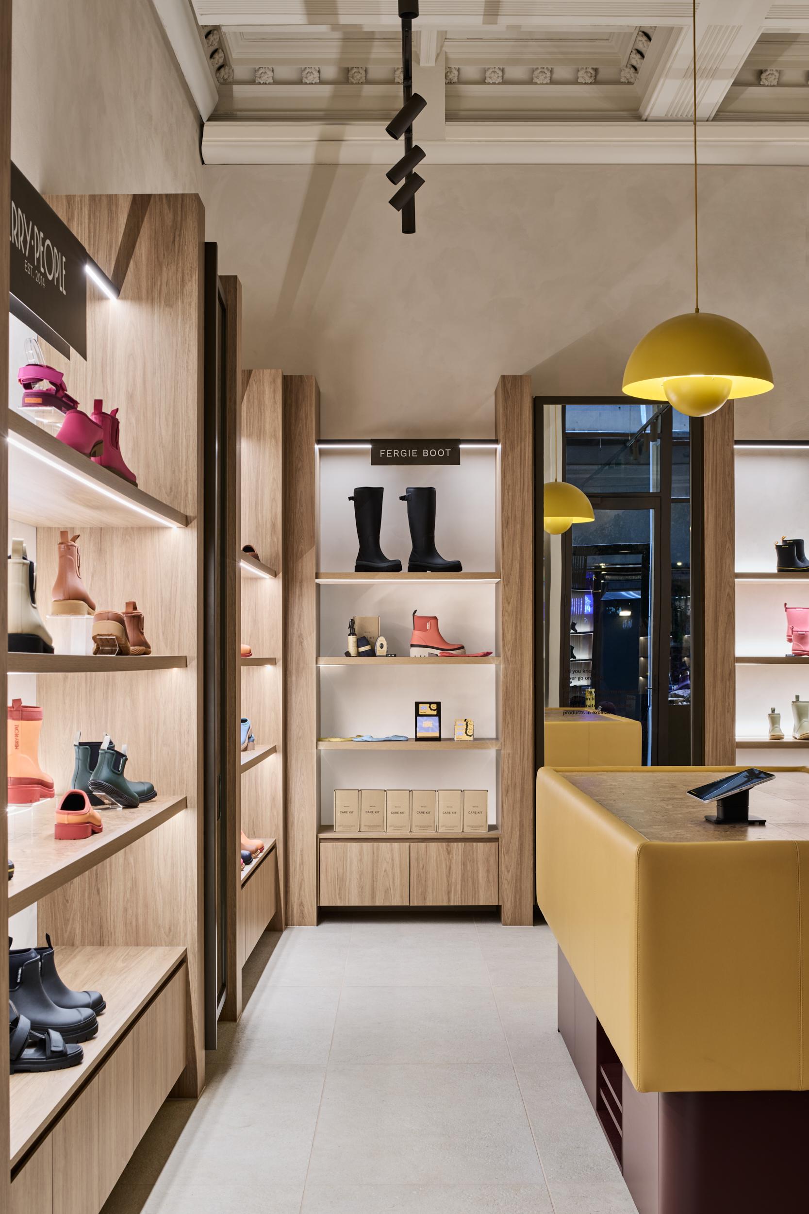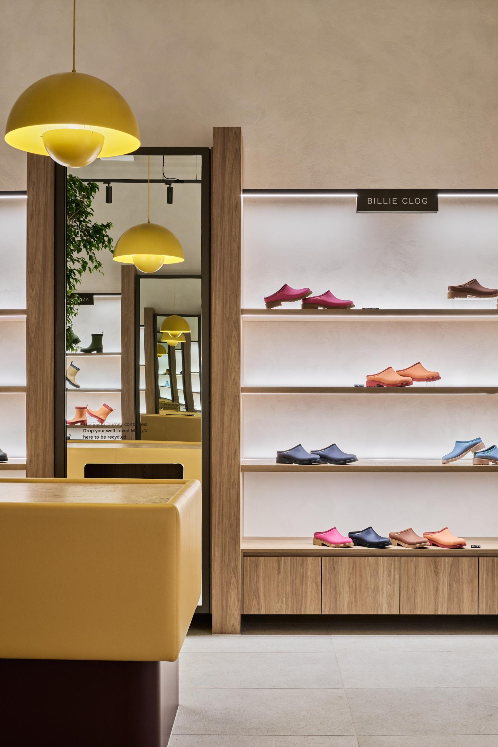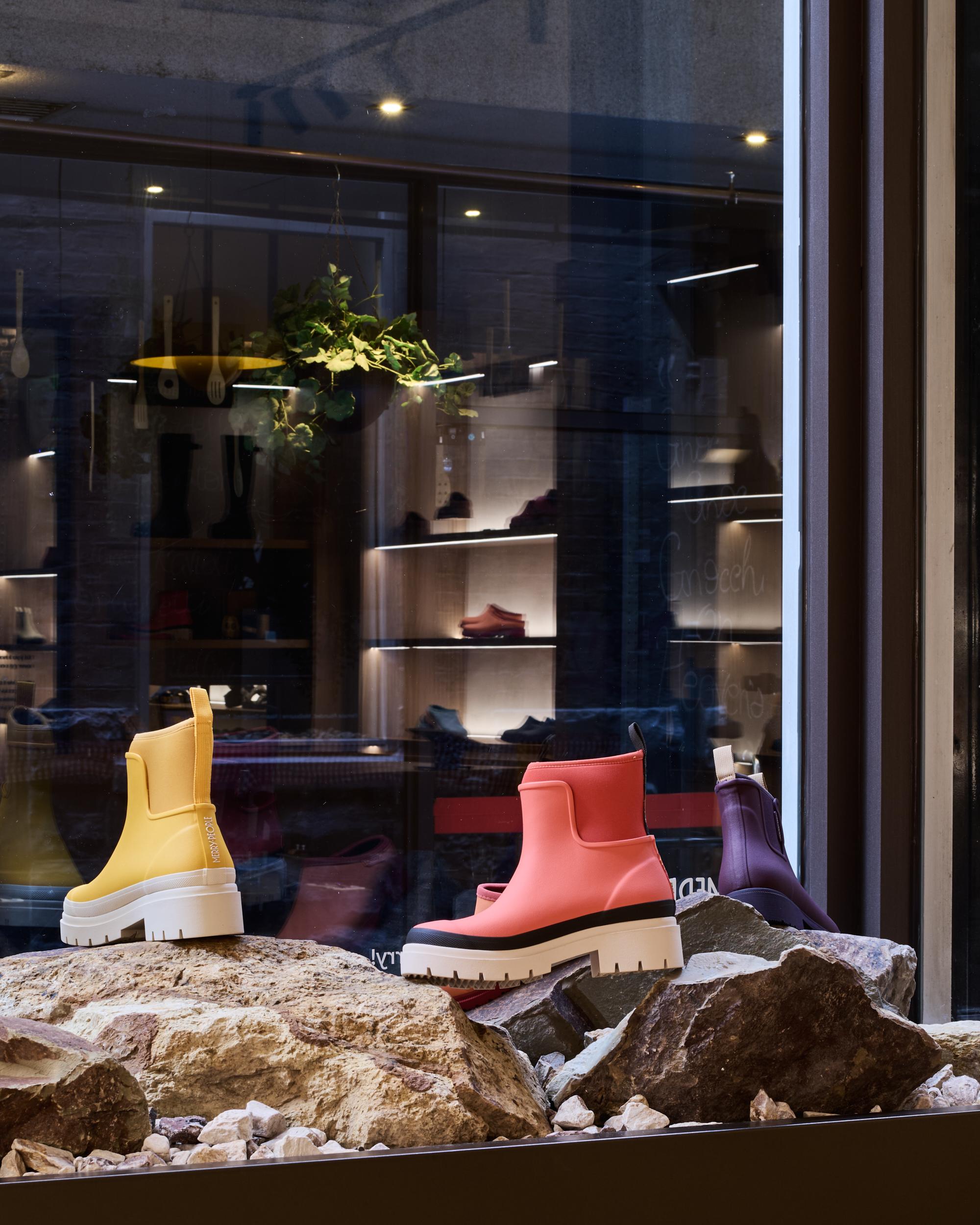 At the heart of the store, a central display with live planting anchors the space, while generous seating, full-height mirrors and an informal point of sale encourage customers to slow down, try on boots and engage.
